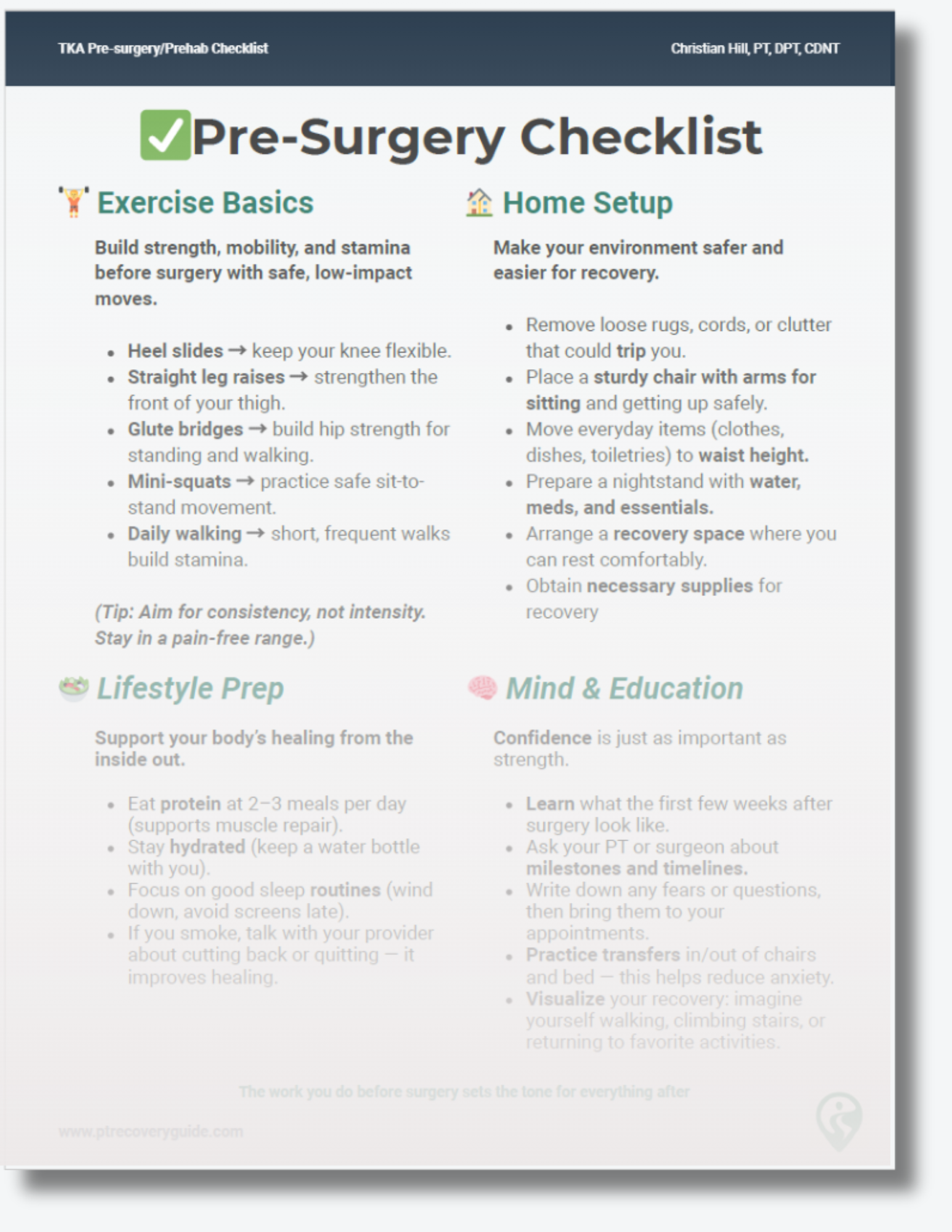 A printable pre-surgery checklist and prehab exercise tracker — created by a Doctor of Physical Therapy with 10+ years of orthopedic experience