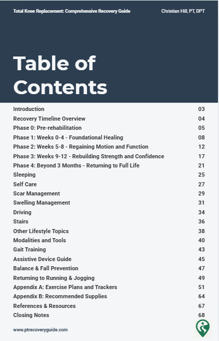 — Roseanne P., TKA patient“This is one of the best documents I have seen regarding total knee rehab and recovery. All of the information in one place is great and all the different levels that you will be in during your recovery….”